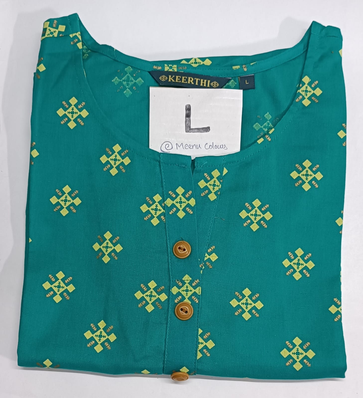 Green cotton kurti . This comes with geometrical prints in yellow colour, complemented by a classic round neckline and buttoned placket.